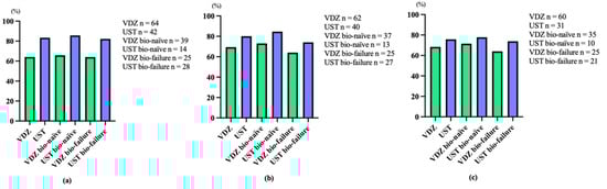 Clinical response rates with vedolizumab (VDZ) and ustekinumab (UST) at weeks 6 and 8 (a), at weeks 22 and 24 (b), and at weeks 54 and 56 (c).