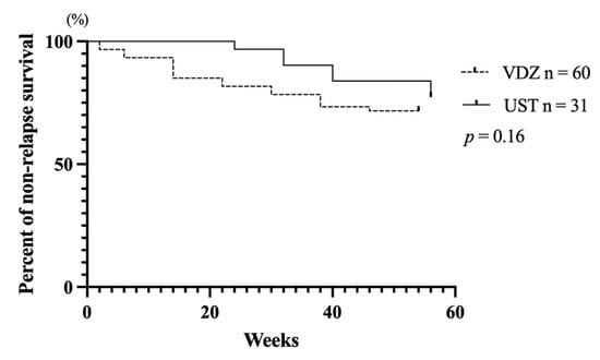 The survival curve depicted the cumulative non-relapse rate up to 54 weeks after VDZ administration and 56 weeks after UST administration. This rate represents the percentage of cases that did not require surgery or medication changes due to worsening symptoms. No difference was observed between VDZ and UST groups (p = 0.16; Figure 4).