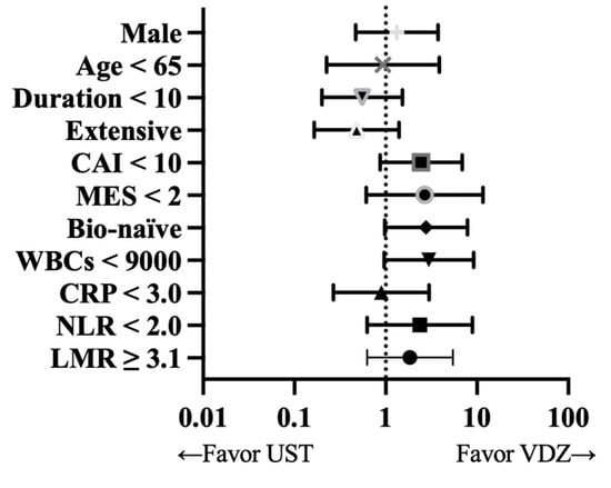 Subgroup analyses aimed to assess differences in remission to VDZ and UST among the following subgroups: male, age, duration, extensive, CAI, MES, bio-naïve, WBCs, CRP, neutrophil/lymphocyte ratio (NLR), and lymphocyte/monocyte ratio (LMR). Subgroups were analyzed to compare clinical outcomes between VDZ and UST groups. Clinical remission rates were evaluated at 6–8 and 54–56 weeks of treatment in a subgroup analysis.