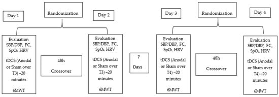 Study timeline—SBP (systolic blood pressure), DBP (diastolic blood pressure), HR (heart rate), SpO2 (oxygen saturation %), HRV (heart rate variability), tDCS (Transcranial Direct Current Stimulation), T3 (left temporal cortex), T4 (right temporal cortex), 6MWT (six-minute walk test).