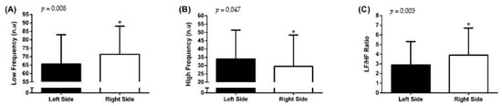 Comparison of overall low frequency (A), high frequency (B), and sympathovagal balance (LF/HF) (C) results on the left and right injured hemispheres. Normalized unit (n.u.). * p ≤ 0.05. Data expressed as overall mean ± standard deviation.