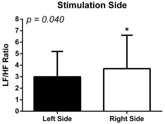Regarding the stimulation site, a lower value of the LF/HF ratio was observed for stimulation performed on the left side compared with the right side (3.0 ± 2.2, left side vs. 3.7 ± 2.9, right side; p = 0.040), regardless of the side with the injury.