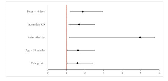 Secondly, incomplete forms and longer duration of fever were risk factors for CALs in our cohort, as already shown in previous studies [1,14]. These two different risk factors could be two sides of the same coin. KD diagnosis is challenging for clinicians, especially in children with incomplete forms, who are at greater risk for late diagnosis and, therefore, longer duration of fever. In addition, these children may receive standard treatment later than those with complete forms, explaining the reason why late treatment is a well-known risk factor for CALs.