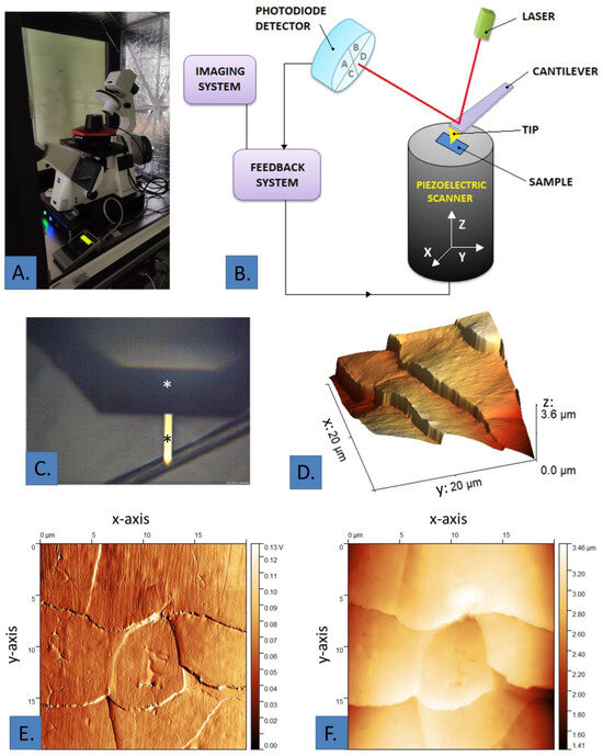 (A) Photograph of the atomic force microscope; (B) schematic of the AFM construction. TIP: tip of the cantilever. (C) cantilever (white asterisk) with AFM tip (black asterisk) scanning hair—optical microscope view; (D) AFM graphic of the hair surface—3D projection: x—the dimension transverse to the longitudinal axis of the hair fiber; y—the dimension parallel to the longitudinal axis of the hair fiber; z—height of hair surface; (E) AFM image of the hair surface—deflection image: x—the dimension transverse to the longitudinal axis of the hair fiber; y—the dimension parallel to the longitudinal axis of the hair fiber; (F) AFM image of the hair surface—Z-axis image: x—the dimension transverse to the longitudinal axis of the hair fiber; y—the dimension parallel to the longitudinal axis of the hair fiber.
