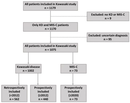 In this context, the Dutch Kawasaki Disease Study was established in 2012 to improve the diagnosis, follow-up, and treatment of KD by investigating its etiology, presentation, and long-term consequences leading to a total number of over 1000 patients. As a tertiary referral center from 1999 onwards, most patients are from the larger Amsterdam region, which serves about 5 million inhabitants in total. Because of its overlapping clinical and immunological features, patients with the severe SARS-CoV-2-related multisystem inflammatory syndrome in children (MIS-C) were included in this study as well [,].