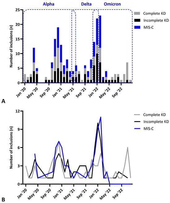 Number of complete KD, incomplete KD and MIS-C inclusions in the Amsterdam cohort in the COVID-19 pandemic with the dominating strains of SARS-CoV-2 depicted in the dashed frames shown per month of inclusion (A) and continuously over-time (B).