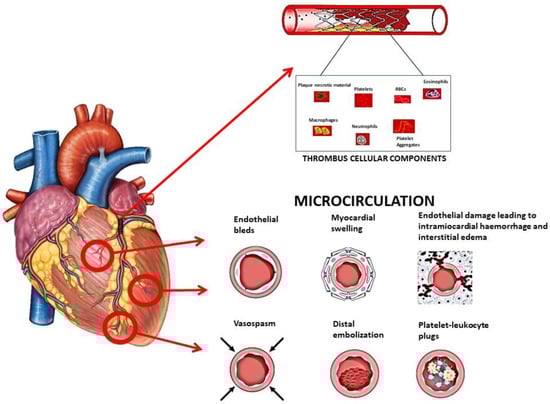 ST-segment elevation myocardial infarction (STEMI) is the major cause of deaths in high-income countries []. Therefore, considerable efforts have been attempted by scientific societies and national governments in the last few decades to implement the organization of dedicated networks for the rapid treatment of STEMI in order to hasten coronary reperfusion in as many patients as possible. A plaque rupture and subsequent thrombus formation, in which platelets play a pivotal role, represent the main pathophysiologic drivers of acute coronary occlusion. In addition, platelets also mediate the impaired reperfusion of the microcirculation that may be observed despite the successful mechanical reopening of the occluded artery due to the distal embolization and release of inflammatory, prothrombotic, and vasospastic substances [,,] (Figure 1). Several studies using invasive or imaging techniques have clearly demonstrated that TIMI 3 flow, mechanically achievable in the vast majority of patients, does not guarantee optimal reperfusion of the microcirculation, which remains suboptimal in about 20–40% of cases [,,], with subsequent impaired short- and long-term outcomes.