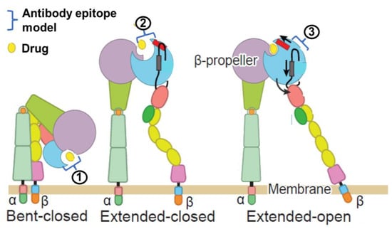 Conformations of GPIIb/IIIa and hypothetical models of small-molecule GPI-associated recruitments of an antibody to GPIIb/IIIa as a function of the conformational change induced by GPIs. GPIIb/IIIa is primarily in a bent–closed conformation (left) on inactivated platelets. With activation and/or ligand binding, GPIIb/IIIa undergoes extension of the headpiece from the legs (centre), and with ligand binding, it undergoes a swing-out motion that results in the adoption of a high-affinity extended–open conformation. The hypothetical models of small-molecule GPI-associated recruitments of an antibody to GPIIb/IIIa are the following: (1) The conformational changes (extension and swing-out) induced by the small molecules are neither sufficient nor necessary. This requires the antibody to be capable of binding to the drug αIIb and/or the β3 complex independent of the conformational change (2). The conformational change is necessary but not sufficient. This requires the epitope to require one or both of the conformational changes and the drug αIIb and/or the β3 complex (3. The conformational change is necessary and sufficient for antibody binding. This requires the antibody to bind to a neo-epitope exposed by one or both of the conformational changes, which is exclusively on αIIb and/or β3, rather than one that requires the drug αIIb and/or the β3 complex. If correct, zalunfiban, which does not induce conformational changes, should not induce thrombocytopenia caused by antibodies that bind according to models 2 and 3. The colors indicate different domains in αIIb and β 3. From top to bottom for each subunit. aIIb: Purple: Propeller; Green: Thigh; Orange: Knee; Light green: Calf 1 and 2; Orange: Transmembrane; Green: Cytoplasmic. β 3: Blue: βI; Pink insert in βI, β1-α1 loop; Orange: Hybrid; Green: PSI; Yellow: I-EGF1-4; Pink: β terminal; Blue: Transmembrane; Orange: Cytoplasmic. This figure was adapted from Lin et al., “A general chemical principle for creating closure-stabilizing integrin inhibitors”, Cell 185: 3533; 2022 [], with permission from Elsevier, and Rikken et al., “Critical analysis of thrombocytopenia associated with glycoprotein IIb/IIIa inhibitors and potential role of zalunfiban, a novel small molecule glycoprotein inhibitor, in understanding the mechanism [s]”, J Am Heart Assoc 2023; 12: e031855 [] with permission from Wiley.