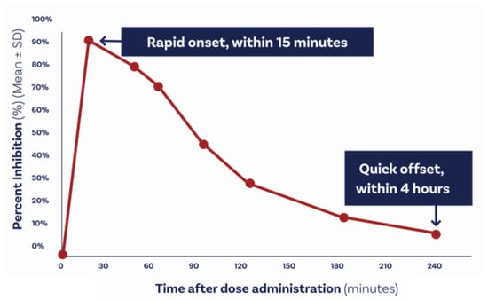 Compared with eptifibatide and tirofiban, zalunfiban is a second-generation small-molecule platelet GP IIb–IIIa inhibitor (Figure 2) specifically designed to inhibit fibrinogen binding, platelet aggregation, and platelet thrombus formation without inducing the conformational changes in the receptor produced by the earlier I.V. drugs mentioned above [], or fibrinogen [], that result in the receptor adopting a high-affinity ligand binding state, with the exposure of otherwise-hidden epitopes on the receptor [,]. At the molecular level, zalunfiban binds to both the αIIb and β3 subunits of the receptor and displaces the Mg2+ ion from the metal ion-dependent adhesion site of the β3 subunit required for binding to fibrinogen and the von Willebrand factor; this locks the β3 subunit of the receptor in its inactive state without exposing neoepitopes [] that are potential targets for preformed or treatment-induced antibodies that may contribute to the thrombocytopenia occasionally seen with eptifibatide or tirofiban [,] treatment. Zalunfiban is also designed to be biologically active following subcutaneous administration and highly soluble so that the anticipated maximal total human dose can be contained in less than 2 mL, opening the possibility of self-administration by an autoinjector. It has a rapid onset of action (reaching peak levels in ≤15 min) after subcutaneous administration, even in patients with STEMI [], and achieves the high-grade inhibition of the platelet function in response to all agonists, including thrombin []. It has a limited time of action (~2 h with T1/2 = ~1 h), which may minimize the risk of bleeding (Figure 4).