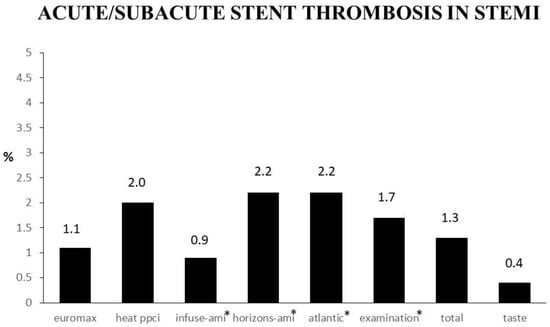 Bar graphs showing the rate of acute/subacute stent thrombosis in several trials on STEMI patients. * definite and probable stent thrombosis.