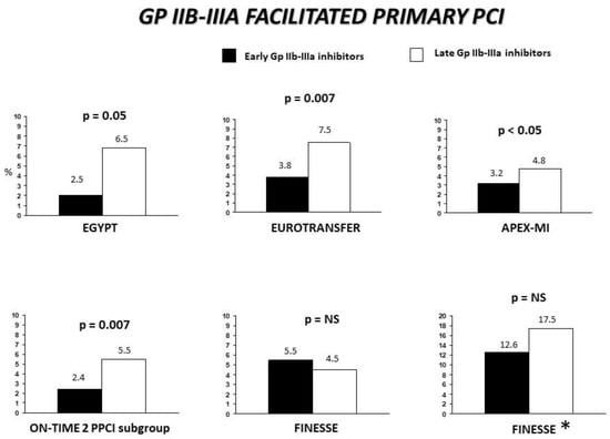 Whereas the ischemia time is a well-demonstrated major determinant of the infarct size, myocardial perfusion, and mortality among STEMI patients, attention has focused on achieving early pharmacological reperfusion, which may especially benefit high-risk patients and patients who require long-distance transportation and who present early [,]. As a result, several randomized trials have investigated the effects of upstream GP IIb–IIIa inhibitor administration in patients undergoing PPCI. The Early Glycoprotein IIb–IIIa inhibitors in Primary Angioplasty (EGYPT) cooperation was a study based on individual patients’ data from randomized trials [], including 1662 patients, of which 840 patients (50.5%) were assigned to early and 822 patients (49.5%) to late GP IIb–IIIa inhibitor administration. This study showed that early upstream GP IIb–IIIa inhibitor use was associated with significant benefits in preprocedural and postprocedural TIMI flow, distal embolization, and myocardial perfusion and that these effects translated into benefits in mortality. Similar findings were observed in diabetic patients []. Most importantly, the benefits in mortality were maintained at up to 12 years of follow-up [].
