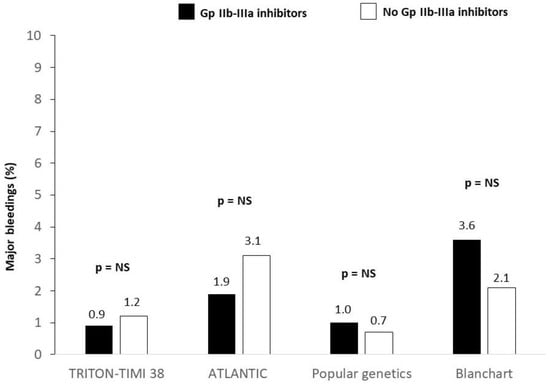 GP IIb–IIIa inhibitors were initially associated with a substantial increase in the risks of bleeding complications, and the later addition of oral P2Y12 inhibitors heightened the concern about bleeding. However, data from TRITON-TIMI 38 [], despite the prevalent use of a femoral artery approach, showed that the use of GP IIb–IIIa inhibitors was associated with a similar risk of major bleeding (1.2% vs. 0.9%) and intracranaial bleeding (0.1% vs. 0%) (Figure 7). Similar findings were observed in the ATLANTIC study [], in which ticagrelor was studied, where the routine use of GP IIb–IIIa inhibitors did not increase the risk of bleeding complications. Most importantly, the switch to a radial artery approach instead of a femoral artery approach significantly reduced the risk of access-site bleeding []. A subanalysis of the Popular Genetics trial, in which 90% of 2378 patients were treated with ticagrelor and 85% with a radial approach, showed that GP IIb–IIIa administration was associated with fewer thrombotic events (hazard ratio (HR), 0.22; 95% confidence interval (CI), 0.09–0.55); fewer MIs (HR, 0.24; 95% CI, 0.08–0.73) and an increase in minor bleedings (HR, 2.32; 95% CI, 1.43–3.76), but no difference in major bleeding (HR, 0.69; 95% CI, 0.19–2.57) was found []. An Italian registry conducted between 2015 and 2018, including 472 STEMI patients undergoing PPCI who were treated with prasugrel or ticagrelor and a periprocedural high-dose bolus of tirofiban, showed a low rate of BARC (2.1%) and 3–5 BARC (1%) bleeding despite the bolus being followed for up to 18 h by a tirofiban infusion in 65% of the population []. A recent meta-regression analysis showed that the mortality benefit of the radial artery approach was significantly modulated by the use of GP IIb–IIIa inhibitors []. In fact, the greater benefit of a radial access was observed in studies with a greater use of these drugs. A recent meta-analysis of studies of GP IIb–IIIa inhibitors in STEMIs [], in which the data were separated into studies reported in 1998–2007 vs. 2008–2016, found that the major bleeding rates were 5.8 vs. 4.3% (p = 0.04) among those treated with or without GP IIb–IIIa inhibitors, respectively, in the early time period and 3.5 vs. 2.4% (p = 0.05) the later time period. Thus, even with the introduction of the more potent P2Y12 oral agents, the major bleeding rate in the later period was actually lower that in the control group in the early period.