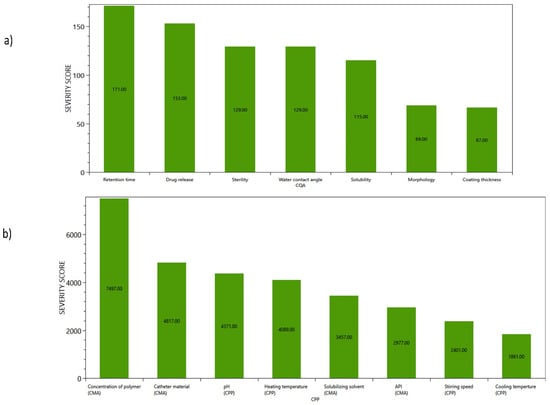 Figure 4a,b. The graphs highlight the parameters that significantly impact the quality of the product during the developmental stage. The findings indicate that the coating retention time, drug release, sterility, and water contact angle are the high-risk factors, with the highest severity score. The most influencing factors responsible for the development of coating are the concentration of polymer (CS), catheter material, pH, and temperature maintained throughout the coating process.