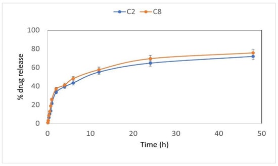 Table S3 (Supplementary Files). The highest drug release of 86.56% was presented by sample C1 composed of 1.5%