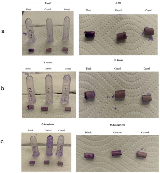 Figure 8a–c shows that the blank catheter displayed the most intense staining, followed by the control samples and coated samples of the catheter with all the three bacterial strains. The results demonstrate that the incorporation of chlorhexidine with chitosan in the coating resulted in the almost complete prevention of biofilm formation, whereas the blank sample exhibited a high tendency to support biofilm growth, and the control samples demonstrated some tendency to support biofilm growth by