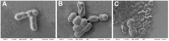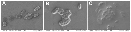 Similar results were obtained by studying the morphology of bacteria using the SEM method after incubation in an analytical chamber with an antibiotic (Figure 10). After incubation with lincomycin, the morphology of bacterial cells was practically unchanged; in addition, they retain the potential for active division (Figure 10A); after incubation with ceftriaxone, under the influence of which an insignificant zone of growth inhibition was detected for A. baumannii 173-p1, the potential for division was preserved, but the integrity of the bacterial cell wall was disrupted, and the bacteria themselves were deformed (Figure 10B). After incubation with doxycycline, to which, according to the disk diffusion method, the bacteria were found to be sensitive, the bacteria died in large quantities, with the release of intracellular contents (Figure 10C).