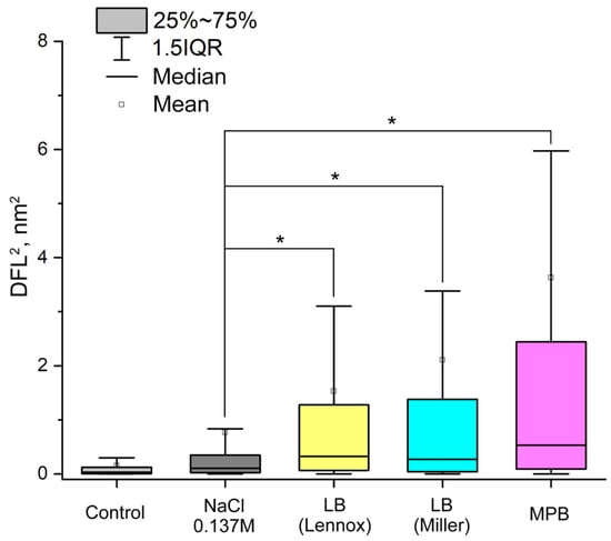 Changes in the nature of A. baumannii 173-p1 nanomotion, depending on cultivation on a nutrient-limited 0.9% NaCl (normal saline solution and nutrient-rich media): LB broth (Lennox) with 0.5% NaCl, LB broth (Miller) with 1% NaCl and MPB (meat-peptone broth (*—differences are statistically significant, p < 0.001)). Variance (DFL2, nm2) was used as a statistically processed signal, the results demonstrate a series of five experiments for each medium.