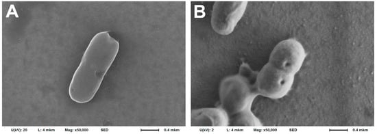 A similar result was obtained in the SEM study (Figure 5). In the case of bacterial nanomotion detection in MPB, the holistic structure of the cells was observed. Additionally, a constriction was found, indicating that the cell was dividing (Figure 5A). In the case of using LB (Miller), the cells were also actively dividing, but minor indentations in the cell wall were observed (Figure 5B).