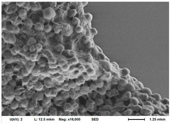 Liquid medium-grown A. baumannii 173-p1 biofilm that was transferred to the surface of the cantilever with a sterile pipette tip kept its structure as shown using SEM (Figure 6). Excess liquid in the tip of dispenser was carefully removed with filter paper. This methodology was used because attempts to grow biofilm directly on the cantilever surface resulted in its complete overgrowth on both sides of cantilever, which requires separation of the excessive part of biofilm from the cantilever’s reflective side. It either led to the breakdown of the cantilever, or, in the case of successful separation, remains of the biofilm on the upper surface resulted in laser scattering and the presence of a noise signal that could not be interpreted as nanomotion.