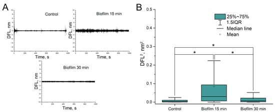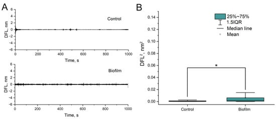 Nanomotion of A. baumannii 173-p1 inside of density biofilm. (A) DFL signal after Fast Fourier transform (up: control-cantilever without biofilm, down: cantilever with biofilm). (B) Statistical analysis of oscillation amplitudes variances (*—differences are statistically significant, p < 0.001).
