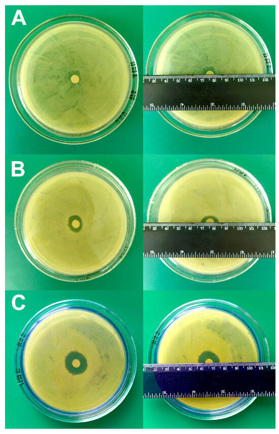 Determination of A. baumannii 173-p1 growth inhibition zones under the influence of different antibiotics using the disk diffusion method. (A) Lincomycin. (B) Ceftriaxone. (C) Doxycycline.