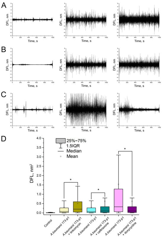 Detection of A. baumannii 173-p1 antibiotic resistance based on bacterial nanomotion, utilizing the DFL signal after Fast Fourier transform. (A) Changes in the amplitude of oscillations in response to lincomycin: the first column shows control oscillations of the functionalized cantilever, the second column shows control oscillations of the functionalized cantilever with bacteria, the third column shows experimental oscillations after immersion of the cantilever in a chamber with an antibiotic. (B) Changes in the amplitude of oscillations to ceftriaxone. (C) Changes in the amplitude of oscillations to doxycycline. (D) Results of statistical processing of obtained oscillation amplitude variances for all studied antibiotics in comparison (*—differences are statistically significant, p < 0.001).