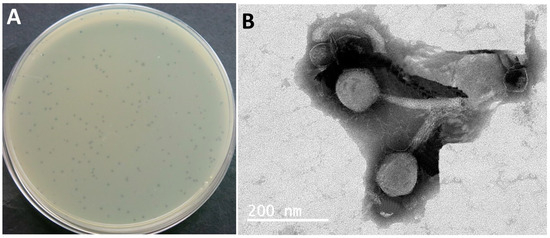Sixteen putative distinct phages were obtained from samples of sewage collected at the Shenzhen wastewater treatment plant in China using methodologies previously outlined [23]. The approach to isolating phages was adapted from established protocols [24]. A quantity of 5 mL of sample was passed through a 0.22 µm filter alone with 10.0 mL of LB broth and 2.50 mL of the specific bacterial strain of interest, and subsequently incubated at a temperature of 37 °C overnight. Following the period of incubation, the mixtures were collected, subjected to centrifugation at a rate of 10,000× g for a duration of 10 min at a temperature of 4 °C, and the resulting supernatants were filtered using a 0.22 μm pore size filter. Then, the solution, referred to as phage lysate, was obtained and utilized in spot assays for phage identification. Any phage plaques that were identified were purified by isolating individual plaques and subsequently propagating them at least six times to guarantee the phage isolate’s purity. The procedure for phage propagation had been previously documented [25]. To generate high-titer phage stocks, the phage stock (100 µL) (approximately 9 log PFU/mL) was combined with the host bacteria culture (100 µL) (ATCC 43890) in 50 mL of LB broth and incubated for 12 h at 37 °C with agitation at 160 rpm. Then, the culture was centrifuged for 10 min with 7000× g. Then, a supernatant was passed through a disposable syringe (sterile) filter (0.22 µm). For further experimentation, the phages were stored at 4 °C.