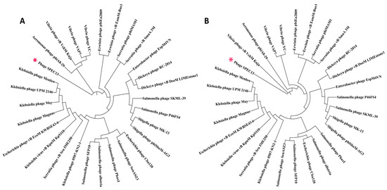 Phylogenetic trees of SPEC13 terminase (large subunit) (A) and major capsid protein (B). The consensus trees were constructed using the corresponding protein of SPEC13 and related phages with MEGA11. The amino acid sequences were aligned using MUSCLE and a neighbor-joining tree with 1000 bootstraps was constructed. Phages SPEC13 were marked in red star.