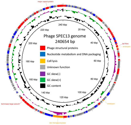 Genome map of SPEC13. Each arrow represents a coding sequence. In red, genes encoding structural proteins; blue, DNA metabolism-associated and packaging proteins; orange, cell-lysis-associated proteins; and in gray, hypothetical proteins constructed by BRIG.jar, 0.95-dist software.