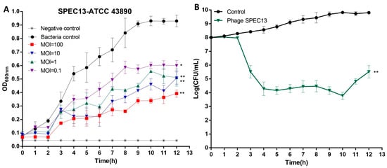 Effect of phage SPEC13 on E. coli O157:H7. (A) Lytic activity, (B) Inhibition of bacterial propagation. Data presented as mean ± SD. n = 3. * p < 0.05; ** p < 0.01.