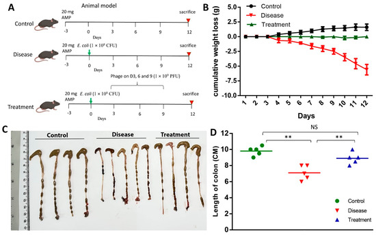 Three days before the initiation of experiments, the mice were divided into three groups (control, n = 5; disease, n = 5 and treatment, n = 5); then, oral administration of ampicillin (20 mg) in 200 µL of saline via gavage was conducted to all groups. On the third day after, the disease and treatment group were fasted for 4 h, before being orally infected with 108 CFU of E. coli in 0.2 mL of 0.1M NaHCO3. Phage SPEC13 (109 PFU) in 0.2 mL of 0.1M NaHCO3 was orally administered to the treatment group mice after the 3rd, 6th and 9th day of E. coli infusion. All phages for in vivo experiments were purified with Detoxi-Gel endotoxin removal gel (Detoxi-GelTM; Pierce Biotechnology, Rockford, IL, USA) according to the manufacturer’s protocol. Throughout the course of the experiment, each mouse was weighed individually at the same time each day, between 9:00 a.m. and 10:00 a.m.