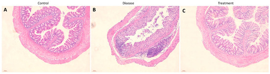 Effect of SPEC13 against disease control. Representative images of rat colonic mucosa of control mice (A), disease group (B) and bacteriophage treated group (C). Scale bar: 100 nm.