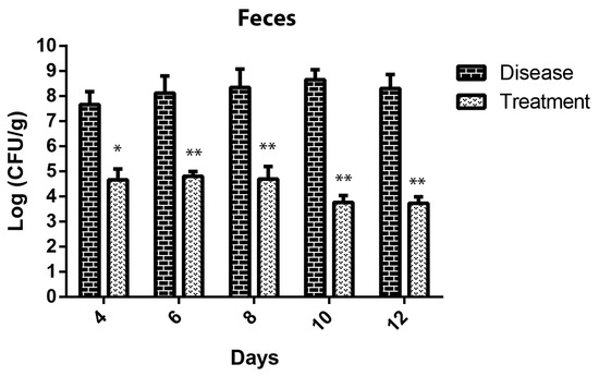 Effect of SPEC13 on reduction in E. coli O157:H7 in feces. Data presented as mean ± SD. n = 5. * p < 0.05; ** p < 0.01.