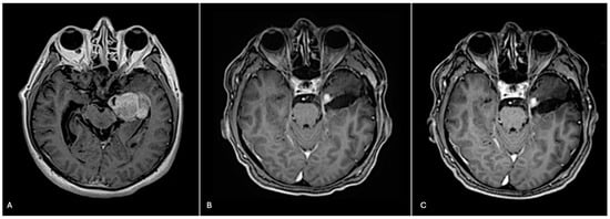 Pre-surgical, post-surgical, and post-2 cycles of temozolomide imaging. (A) Pre-surgical axial T1 brain MRI with contrast reveals a 4.3 cm enhancing mass. (B) Post-radiation axial T1 brain MRI with contrast reveals a residual 1 cm enhancing nodule at the medial aspect of the resection cavity. (C) Following two cycles of adjuvant temozolomide, axial T1 brain MRI with contrast reveals a stable residual 1 cm enhancing nodule at the medial aspect of the resection cavity.