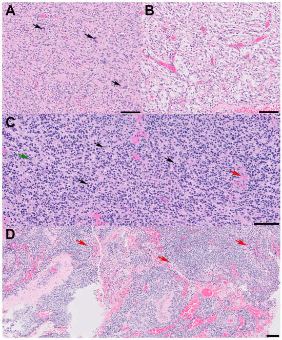 Histopathologic features. All scale bars are 100 microns. (A) Sections reveal glial cells with spindled and hyperchromatic nuclei with a compact growth pattern and (B) intervening areas of the microcystic background. Note the pleomorphic, bizarre cells with smudgy chromatin in panel (A) (arrows); (C) in other areas, tumor cells with round nuclei and scant chromatin show infiltrative growth patterns and high-grade features. Note the entrapped cortical neuron (green arrow), mitotic figures (black arrows), and incipient microvascular proliferation (red arrow); (D) some high-grade areas show pseudopapillary architecture due to geographic necrosis (red arrows) and viable tumor cells clinging around vessels.