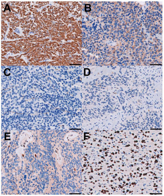 Immunohistochemical features. All scale bars are 50 microns. (A) Tumor cells are positive with GFAP and (B) weakly positive with synaptophysin; (C) neurofilament stain highlights entrapped axons in the high-grade areas; (D) p16 is essentially negative, which can be interpreted as a “loss” in tumor cells; (E) ATRX is lost in tumor cells in the high-grade areas and retained in endothelial cells; (F) Ki-67 labeling index is approximately 40% in high-grade areas.