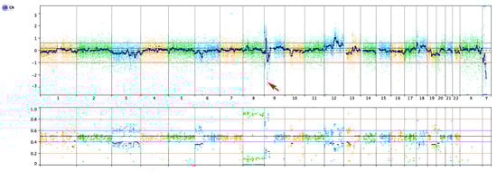 Copy number profile showed gains and losses of multiple chromosomes, and homozygous deletion of CDKN2A/CDKN2B (red arrow).