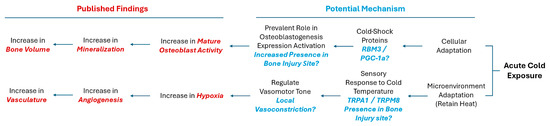 With this in mind, we hypothesized that with the application of cold, there may be an increase in the presence of RBM3 and PGC-1α within the bone injury site, which could facilitate the differentiation of osteoblasts and explain documented cases of increased mineralization of newly formed bone (Figure 1). Additionally, exposure to cold requires a microenvironmental adaptation to maintain heat homeostasis that involves a sensory response to the cold temperature, leading to the activation of TRPA1 and TRPM8 channels. This in turn may highlight localized vasoconstriction that explains the increase in hypoxia detected and, subsequentially, the enhanced vasculature network within bone injury sites (Figure 1).