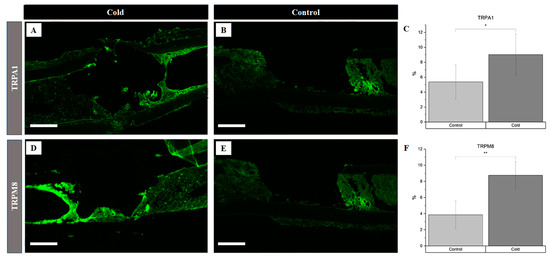 Identification of receptor proteins involved in vasoconstriction within a cortical defect following cold exposure. TRPM8 and TRPA1 detection (bright green) within the cortical defect region (4× magnification). Scale bar represents 500 µm. (A,D) are non-treated femurs serving as a baseline. (B,E) are cold-treated femurs. (C) TRPA1 staining expression analysis (n = 8) of positive staining for TRPA1 in the control group was 5.38 ± 2.32, while in the experimental group it was 9.03% ± 2.78 (* p-value = 0.012). (F) TRPM8 staining expression analysis (n = 8) of positive staining for TRPM8 in the control group was 3.86% ± 1.72, while in the experimental group it was 8.75% ± 1.68 (** p-value < 0.001).