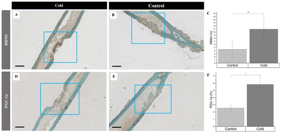 Simultaneously, the increased detection of PGC-1a and RBM3 were prevalent in newly formed bone cells and the surrounding matrix within the cortical defects following cold exposure. RBM3 significantly (p-value < 0.008) increased (Figure 4C) within cold-treated femora (Figure 4A) (11.0% ± 4.26%) compared to non-treated (Figure 4B) femora (4.47% ± 2.84%)). Synonymously, PGC-1a was significantly (p-value = 0.039) elevated (Figure 4F) in cold-treated cortical defects (Figure 4D) (5.85% ± 1.01%) in comparison to non-treated (Figure 4E) defects (2.57% ± 0.36%). An increase in the presence of RBM3 and PGC-1a indicates that cells within the bone injury site are affected by cold exposure, resulting in the stimulation of proteins responsible for cellular adaptation required for cell survival [19,33,34]. Furthermore, the percentage of PGC-1a and RBM3 positive cells marked by DAB staining (brown) within and around the cortical bone defect in the hindlimbs of mice exposed to a cold stimulus was higher in comparison to the control hindlimbs, which is of particular interest, in part, due to the prominent roles RBM3 and PGC-1a have in osteoblastogenesis pathways.