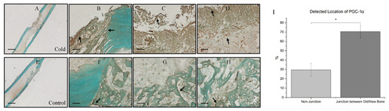 Prevalence of PGC-1a at the junction of old and new bone formation following cold therapy treatment. (A,E) at 2.5× magnification. Scale bar represents 500 µm. (B–D,F–H) at 20× magnification. Scale bar represents 50 µm. PGC-1a has been shown to be upregulated (I) at the junction of new and old bone. (F–H) Furthermore, PGC-1a expression within these junctions appears to be elevated following cold exposure (B–D) indicating PGC-1a upregulation. (I) Detected location of PGC-1α staining expression analysis (n = 8) of PGC-1α within cells at the junction of newly formed bone and old bone was 70.56% ± 7.08, while in non-junctional regions it was 29.44% ± 7.08 (* p-value < 0.00001).
