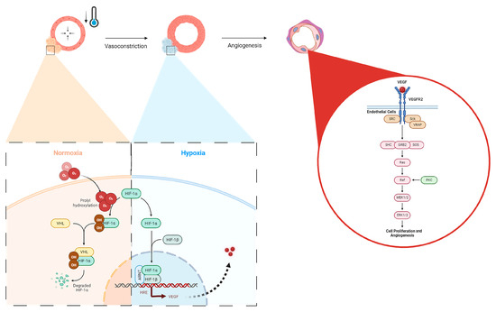 Hypoxic upregulation following vasoconstriction via local cold exposure and the impact on angiogenic pathways. Under normal oxygen conditions, HIF-1a is degraded via von Hippel–Lindau (VHL) disease after prolyl hydroxylation, but in hypoxia, HIF-1a forms a dimer with HIF-1B, nucleolocalizes with the aryl hydrocarbon receptor nuclear translocator (ARNT), leading to VEGF expression through the HRE pathway, which then activates VEGFR2 in endothelial cells, upregulating cellular proliferation and angiogenesis via the Ras/Raf signaling pathway.