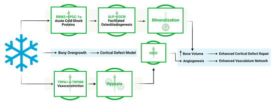 Collectively, cold exposure initiates a shift in cellular expression, especially within bone cells, stimulating anabolic bone formation pathways. Established reports in the literature have shown that cold exposure induces rapid cellular responses, largely mediated by the activation of cold-shock proteins [18,19]. RNA-binding motif protein 3 (RBM3), in particular, has been established as the most representative protein expressed under cold shock [20]. Similarly, peroxisome proliferator-activated receptor gamma coactivator 1-alpha (PGC-1α) is a key regulator in bone homeostasis, affecting primarily osteoblastogenesis, as well as mitochondrial biogenesis [21]. Both cold-shock proteins have a prominent role in the cellular adaptation necessary for cellular survival [22,23]. Recently, these proteins have garnered particular attention for their potential impact on bone repair, due to their prevalence in osteoblastic cells and their pivotal role in regulating osteoblastogenesis pathways [19]. Additionally, it has been previously established that compromise of the vascular network in and around bone results in hypoxia, leading to the activation of a key mechanism in bone healing to restore blood flow, i.e., angiogenesis [24]. Angiogenesis is a critical part of the bone healing process, in order to restore native blood flow following a bone injury [25]. In vivo bone injury studies have shown enhancement of the vasculature following cold treatment, with angiogenic markers, such as the vascular endothelial growth factor (VEGF), being upregulated, which is indicative of the enhancement of angiogenic pathways. However, there is a lack of findings regarding the mechanism of action at the bone injury site [3,17]. Reports have shown that short-term cold exposure effects bone perfusion [26]; for instance, 10 min of immersion in water at 22 °C causes an approximately 40% reduction in whole-limb blood flow [7].