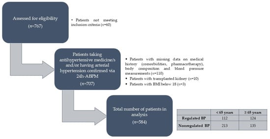 Patients prescribed with antihypertensive medicine/s (AMs) and/or with confirmed AH via 24 h ambulatory blood pressure monitoring (24h-ABPM) (criteria/threshold applied: systolic blood pressure > 130 mmHg and/or diastolic blood pressure > 80 mmHg) were included if they avoided the following exclusion criteria: (i) incomplete or invalid blood pressure measurement, (ii) pregnancy, (iii) immobility, (iv) implanted pacemaker or cardioverter–defibrillator, (v) limb amputation, (vi) existing edema, (vii) existing acute infection, or (viii) active underlying malignant disease. The selection process with the inclusion and exclusion criteria is visually presented in detail in Figure 1.
