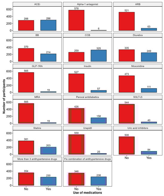A total of 584 participants (48.6% females) were included in the study, with a median age of 63 years (IQR 19). Table 1 presents the sociodemographic, body composition, and 24h-ABPM parameters. Supplementary Table S1 provides a more comprehensive overview of the general characteristics of the study population. Furthermore, Figure 2 provides a detailed overview of the pharmacotherapy prescriptions among the study participants.