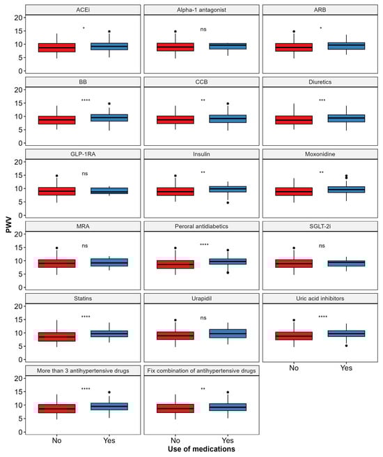 Pulse wave velocity values based on pharmacotherapy prescription patterns. Abbreviations: PWV—pulse wave velocity; ACEi—angiotensin-converting enzyme inhibitors; ARB—angiotensin receptor blocker; BB—beta-blocker; CCBs—calcium channel blockers; GLP-1RA—glucagon-like peptide-1 receptor agonist; MRA—aldosterone antagonist; SGLT-2i—sodium–glucose transport protein 2 inhibitors. p-value labels: **** p < 0.0001, *** p < 0.001, ** p < 0.01, * p < 0.05, ns depicts no statistical significance (p > 0.05).