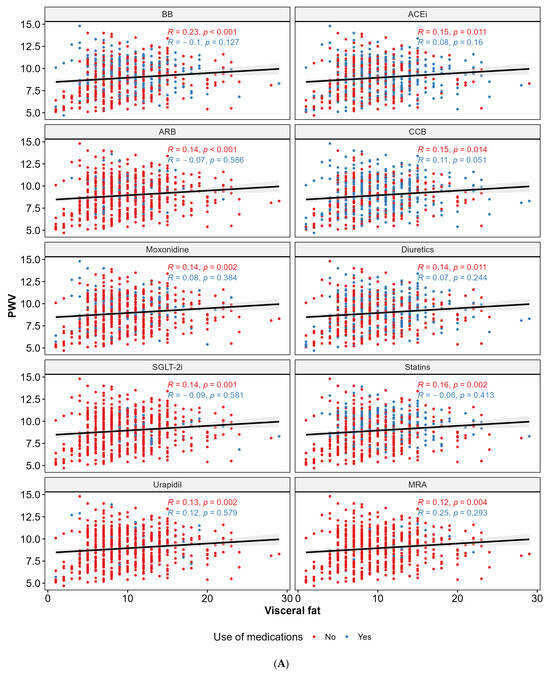 Correlations between PWV and VF level within medication groups (A) and age (B). Abbreviations: PWV—pulse wave velocity; ACEi—angiotensin-converting enzyme inhibitors; ARB—angiotensin receptor blocker; BB—beta-blocker; CCB—calcium channel blockers; MRA—aldosterone antagonist; SGLT-2i—sodium–glucose transport protein 2 inhibitors; yrs—years.
