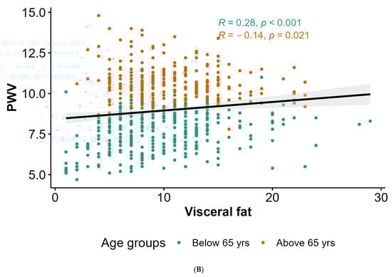 To further investigate the relationship between PWV and VF level, we analyzed the correlation between these factors while considering medication use and age. A statistically significant positive correlation between PWV and VF level was observed in the participants not using ACEi, ARB, CCB, moxonidine, SGLT-2i, MRA, diuretics, urapidil, BB, or statins. Additionally, a statistically significant positive correlation between PWV and VF level was found in the participants younger than 65 years old. Conversely, the participants aged 65 years or older exhibited a statistically significant negative correlation between PWV and VF level. Figure 4A,B illustrate these findings.