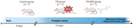 - RES + PS: Rats administered an effective dose of resveratrol via intraperitoneal injection one hour before the onset of predatory stress (n = 22).