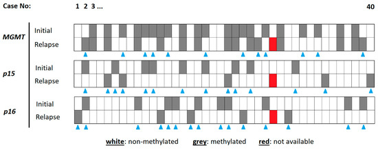 Details of methylation analysis for each specimen. The cases are organized from left to right (1–40). The different methylation sites are indicated on the left, for the initial tumor and the relapse tumor. A methylated gene promoter is indicated in grey, a non-methylated one in white. The blue triangles indicate cases with a chance in methylation status between initial and relapse tumor tissue. The red tiles represent cases with no methylation result.
